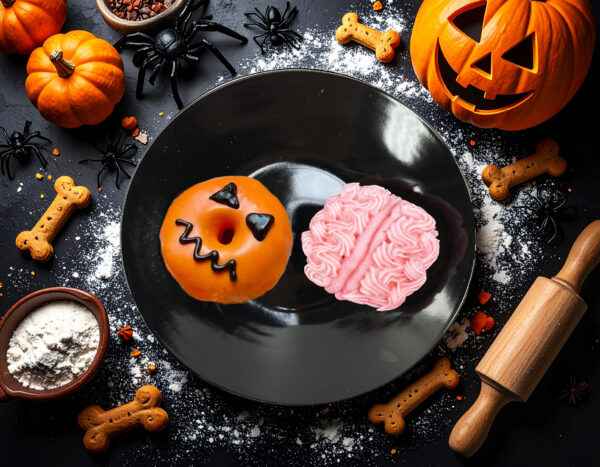 Esta vez el Combo Halloween contiene una ️Donut Calabaza de Ternera cubierta con salsa de zanahoria (100 g)  acompañada de un Muffin Cerebro de Banano y Papa (100 g) .
